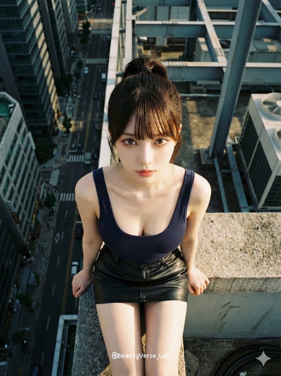 A cinematic film still prompt for Nano Banana Pro designed to generate an extreme top-down medium shot of a woman sitting on the edge of a skyscraper, looking directly up at the camera. The prompt emphasizes faithful replication of the reference image's subject details, high contrast daylight, and a dizzying urban vertigo mood with a Kodak Portra 800 aesthetic.