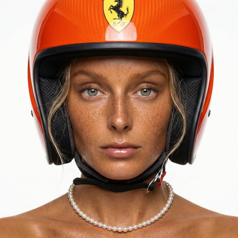 A highly detailed, structured JSON prompt for generating a hyper-realistic, high-fashion studio portrait. The subject is wearing a safety-orange racing helmet and a strand of South Sea pearls, emphasizing the contrast between technical performance and old-money luxury. The prompt specifies extreme detail in texture fidelity (skin pores, oil, grain) and clinical high-key lighting.
