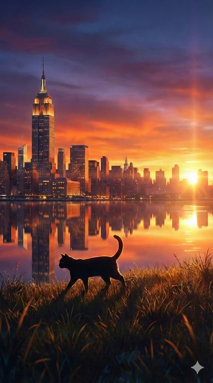 A prompt for generating a fantastical and vivid landscape photograph at sunset. It features the silhouette of a black cat walking through the grass, backlit by the golden light of the setting sun. The background includes a lake reflecting a cityscape, including the Empire State Building, creating a mysterious atmosphere with a warm color gradient of orange, purple, and blue.