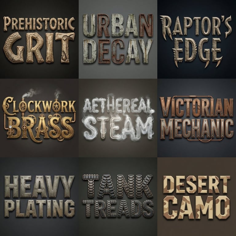A conceptual prompt instructing the AI to analyze uploaded images (a dinosaur, a tank, a kinetic sculpture) and borrow elements from their shapes and aspects to create new, unique fonts. The output is requested as a 3x3 grid showcasing the new, inspired fonts.