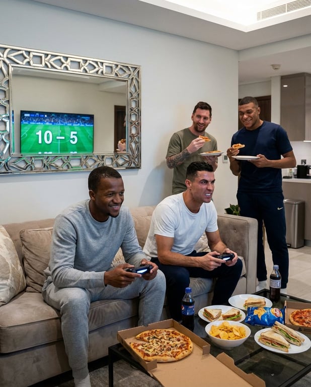 A complex, narrative-driven prompt for a hyper-realistic cinematic photograph capturing a humorous, unstaged moment in a modern apartment. The scene features the main subject (identity locked from reference photo) celebrating a dominant video game victory (10-5 score visible in a mirror reflection) while Cristiano Ronaldo shows competitive rage and Lionel Messi and Kylian Mbappe casually observe and eat snacks.