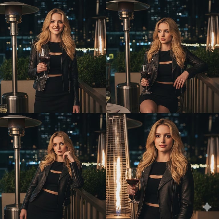 A detailed JSON-formatted prompt designed for the Gemini Nano Banana Pro model to generate a four-image collage featuring a person in an upscale, urban nightlife setting. The prompt specifies scene details, composition, subject appearance, clothing, expressions, and poses, all centered around a warm, intimate atmosphere.