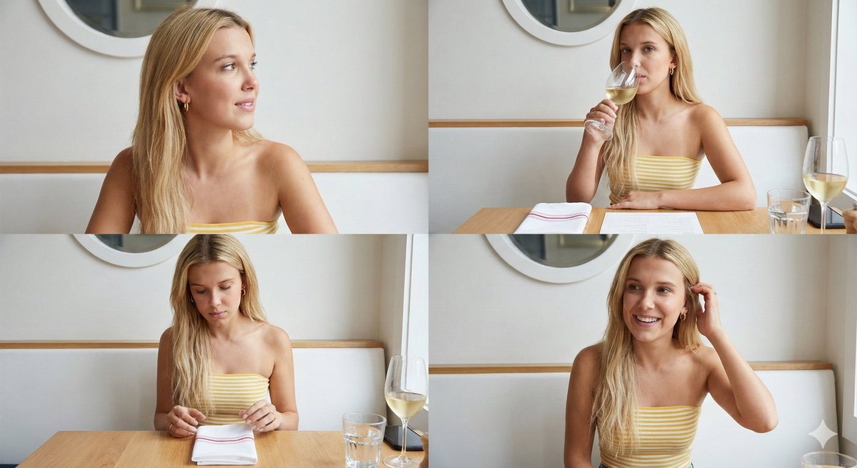 A detailed JSON prompt for generating a four-image collage in a summer lifestyle editorial style, depicting a young woman in an upscale restaurant setting, focusing on natural light, candid poses, and specific wardrobe details.