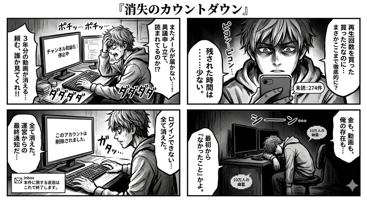 A prompt for generating a four-panel manga titled 'Countdown to Disappearance' using Nano Banana Pro (Gemini 3 Pro Image). The theme revolves around the concept of purchasing views for YouTube videos, contrasting it with the user's own zero-content playlist.