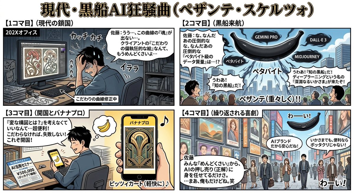 A prompt used with Nano Banana Pro (Gemini 3 Pro Image) to generate a four-panel manga titled 'Modern Black Ship AI Rhapsody (Pesante Scherzo),' discussing the impact of AI.