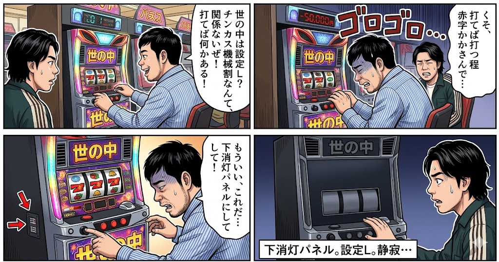A prompt for generating a four-panel manga titled 'The World is Setting L' using Nano Banana Pro, referencing the comedy duo Reiwa Roman and the concept of 'Setting L' (a rigged setting in gambling).