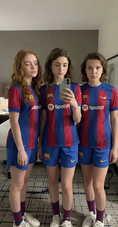 A prompt for generating a photorealistic image of three recognizable actresses (Sadie Sink, Natalia Dyer, and Millie Bobby Brown) posing for a casual, deadpan mirror selfie while wearing identical FC Barcelona football kits in a modern hotel room setting.