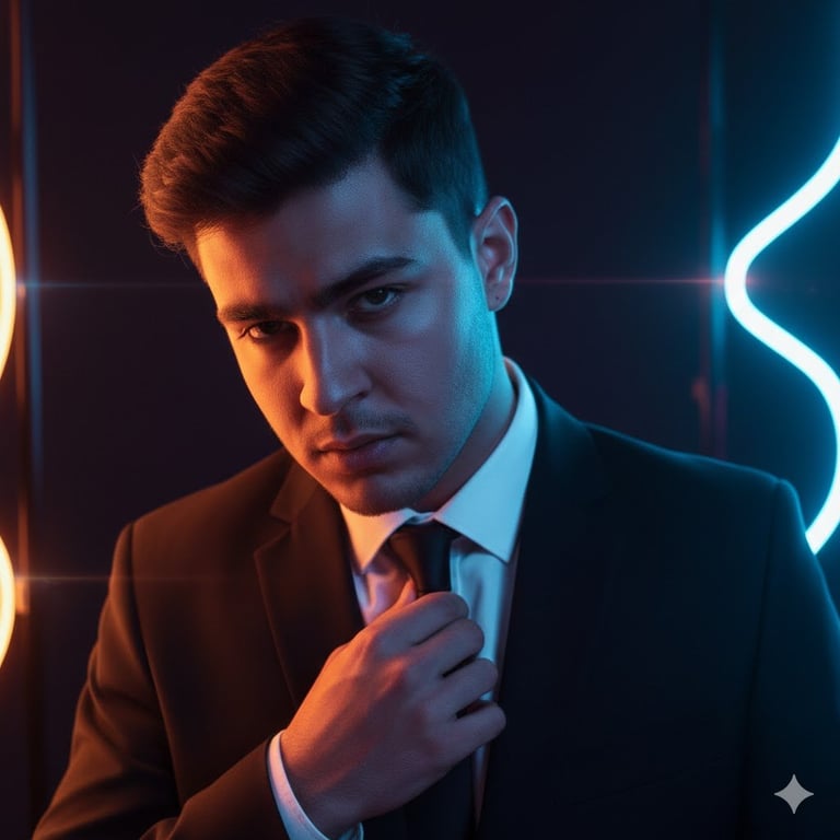 A detailed, structured prompt for generating a hyper-realistic cinematic close-up portrait of a young man with a futuristic noir aesthetic. The key elements are dramatic dual-tone neon lighting (orange and blue), a black tailored suit, sharp facial features, and ultra-sharp focus, set against a dark studio background with neon accents.