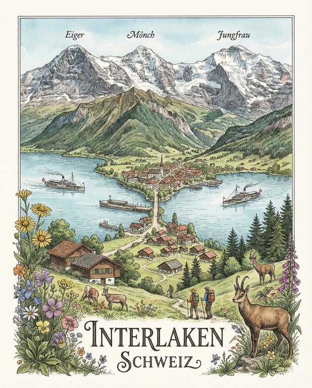 A straightforward prompt for Nano Banana Pro to generate a highly detailed, geographically accurate precision illustration of the Interlaken region in Switzerland, specifying a 4:5 vertical aspect ratio. The resulting image resembles a 19th-century travel poster and was verified for accuracy by Claude AI.