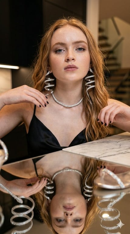 A detailed JSON prompt for generating a high-fashion, glamorous image of a woman in a luxury interior setting. The prompt focuses heavily on attire (satin slip dress, rhinestone heels), pose, and the environment (marble countertop, modern staircase), emphasizing photorealism and a high-end lifestyle aesthetic.