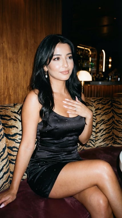 A highly structured JSON prompt for generating an ultra-photorealistic, candid flash portrait of a glamorous woman seated in a dark, upscale bar. The prompt specifies hard flash lighting, a patterned velvet booth (animal/tiger print), a satin mini dress, and realistic skin texture without artificial smoothing.