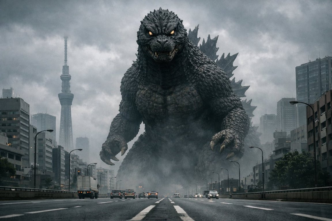 A detailed image generation prompt for creating a realistic, low-angle, sci-fi monster movie style photograph of a giant, 70s-style Japanese Godzilla standing on a wide national road in the high-rise district of Tokyo, with the Tokyo Skytree visible under a cloudy sky. The prompt specifies the aspect ratio and that Godzilla should be staring directly at the camera.