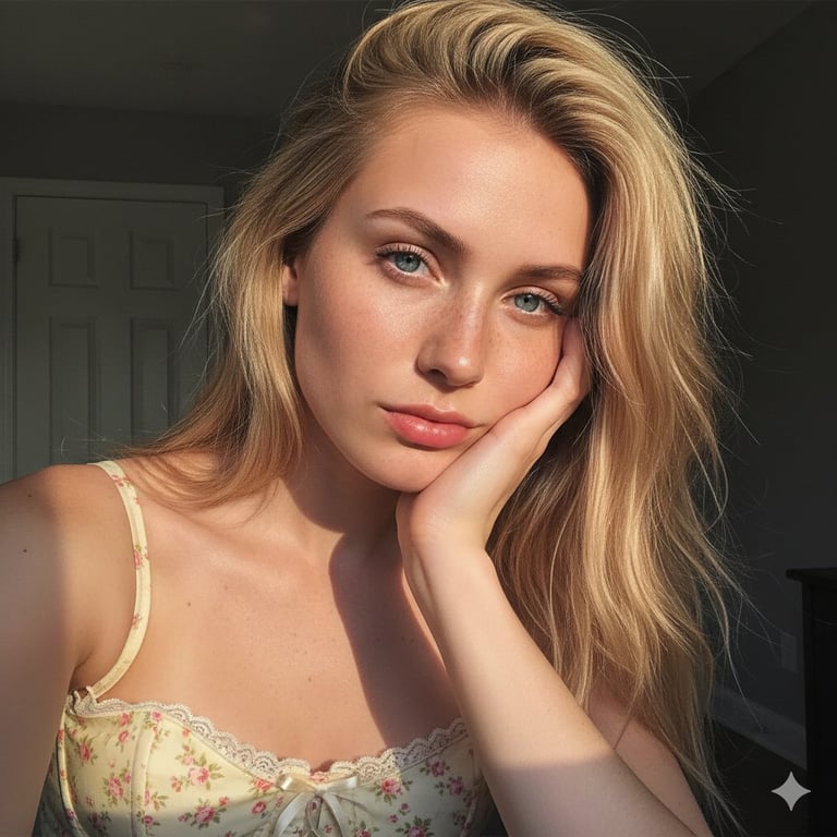 A detailed prompt for a close-up, ultra-realistic portrait in a candid selfie style. It focuses on the subject's highly textured skin with prominent freckles, illuminated by dramatic golden hour side lighting, creating a warm, intimate, and ethereal summer afternoon mood.