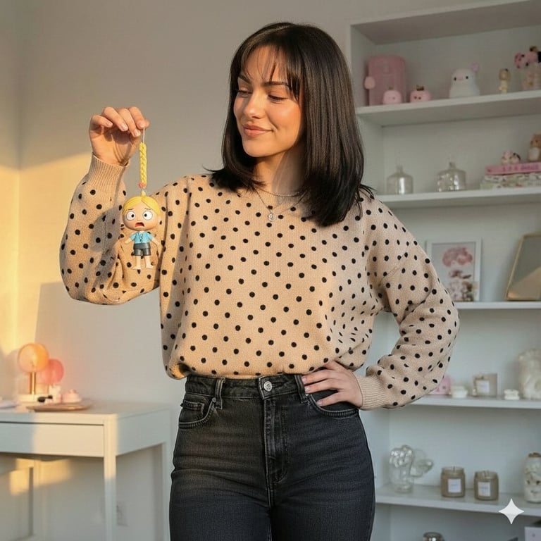 A detailed lifestyle photography prompt for generating a medium shot portrait of a young woman in a cozy indoor setting during golden hour. The focus is on the subject's interaction with a small, delicate hanging doll ornament, emphasizing warm lighting, a serene expression, and an influencer-style aesthetic within a pastel-colored bedroom environment.