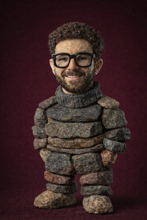 A structured JSON prompt for Nano Banana Pro, instructing the model to transform an uploaded image into a figurine made of multiple, separate, irregular natural stones, strictly using the original image only for silhouette and pose reference.