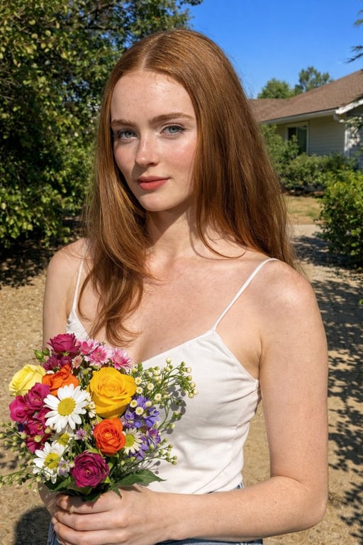 A detailed JSON-structured prompt for Nano Banana 2, aiming to generate a raw, realistic outdoor portrait of Sadie Sink and Ana de Armas holding flowers under harsh midday sunlight. The prompt emphasizes high contrast, hard shadows, visible skin texture, and specific camera settings to mimic an unfiltered phone photo.