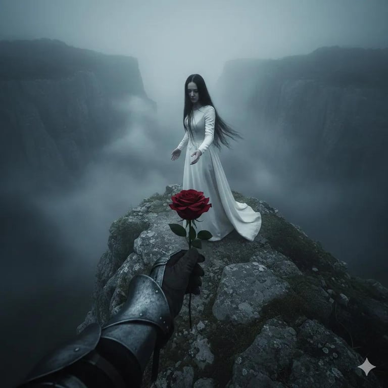 A prompt for generating a haunting cinematic scene featuring a pale woman in a medieval gown on a mist-shrouded cliff, reaching for a red rose offered by a figure in black armor (first-person perspective), emphasizing moody, desaturated blue-gray tones.