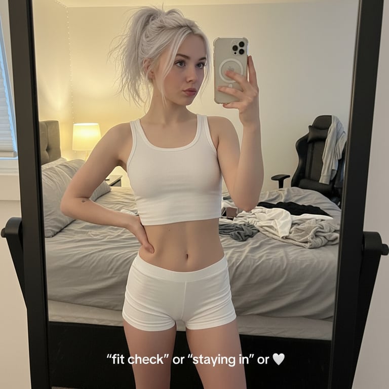 A highly detailed image generation prompt for Nano Banana Pro, describing a young woman taking a classic high-angle mirror selfie in her messy bedroom. The prompt specifies her platinum blonde hair, fitted loungewear (cropped tank and boy shorts), pose, and the detailed background elements like the unmade bed and LED strip lights, aiming for a photorealistic, casual aesthetic.