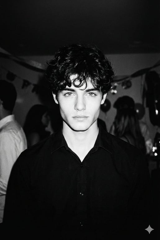 A prompt for generating a high-contrast black and white photo of a young man, using the user's face from an uploaded selfie. The image should mimic the grainy, lo-fi aesthetic of a 1990s disposable camera, set at a dark house party. The focus is on the subject's intense, predatory gaze, reflecting the harsh camera flash, embodying a 'dark academia' bad boy vibe.