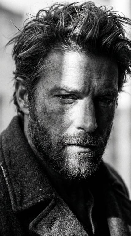 A prompt for generating an extreme close-up, black and white portrait of a rugged, handsome man. It emphasizes dramatic lighting, deep shadows, detailed textures (beard, stubble), and a melancholic expression to achieve a high-contrast cinematic masterpiece.