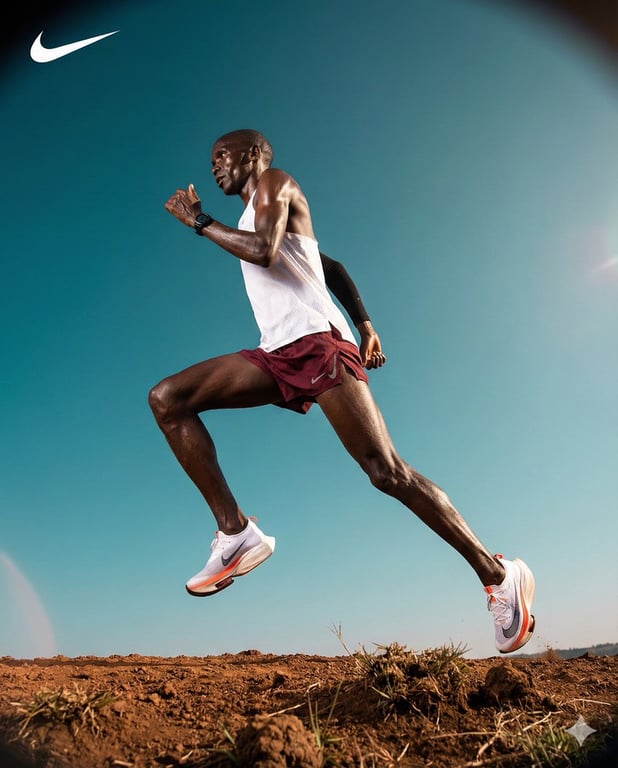 A detailed commercial advertising prompt for generating a high-contrast, ultra-realistic sports photograph of an elite East African marathon runner mid-stride, captured from an extreme worm's-eye view with hard sunlight, emphasizing muscle definition, sweat sheen, and specific Nike footwear details.
