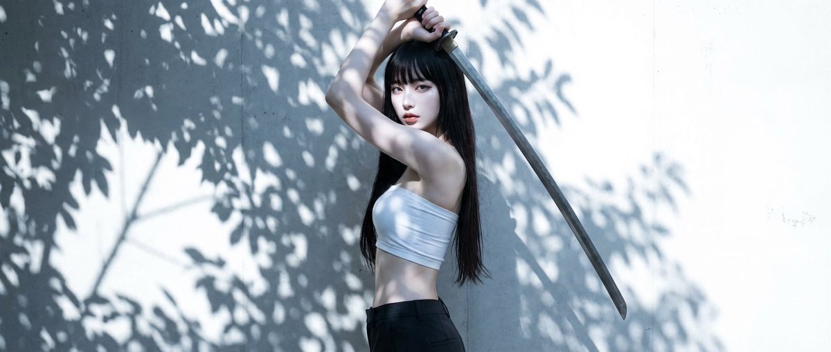 A highly detailed image generation prompt designed for the Higgsfield Nano Banana Pro model, specifying a 21:9 aspect ratio. The prompt meticulously defines composition, lighting (strong side-backlighting with hard leaf shadows), subject features (young Japanese woman, K-pop inspired makeup, long black hair), clothing (white bandeau crop top), color system (cool white, gray, deep black), camera angle, image quality, atmosphere, and a specific action pose involving a katana, creating a cold, sharp, and dramatic portrait.