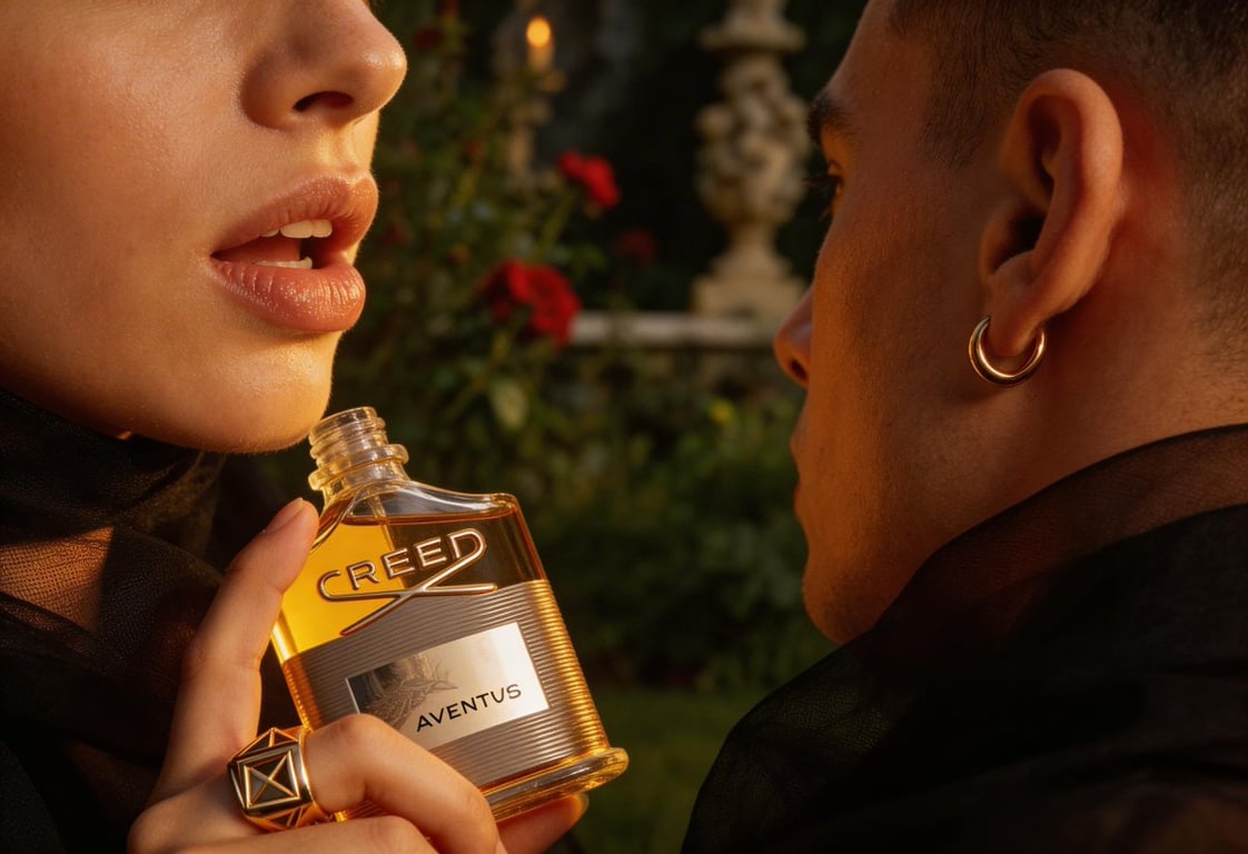 A highly detailed prompt for generating a hyper-realistic, high-end fashion editorial close-up shot focusing on tactile intimacy between two women, set in a moody Venetian garden, featuring a bottle of Creed Aventus and cinematic candlelight lighting.