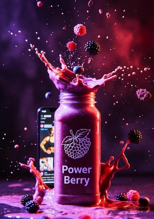 A prompt for Nano Banana Pro to generate a commercial-style, high-energy product shot of a 'Power Berry' smoothie. It specifies dynamic action (exploding splash), floating ingredients, dramatic neon lighting, and a modern fitness/lifestyle aesthetic with a blurred background element.