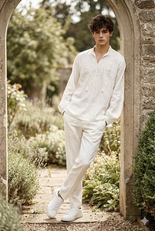 A detailed prompt for generating a high-fashion editorial photograph of a young man in a stylish white boho outfit and clean sneakers, set in a garden with artistic framing, aiming for a Vogue-inspired, glossy magazine aesthetic.