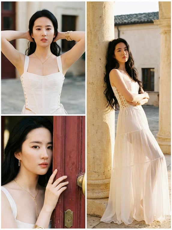 A detailed Nano Banana Pro prompt for generating a high-fashion editorial triptych collage featuring a female subject in a Mediterranean courtyard. The prompt specifies the collage layout, color blocking (White vs. Crimson Red), detailed wardrobe (Deconstructed Victorian corset, tiered maxi-skirt), and environment (sun-bleached stone, red wooden doors) to achieve a historic, romantic vibe.