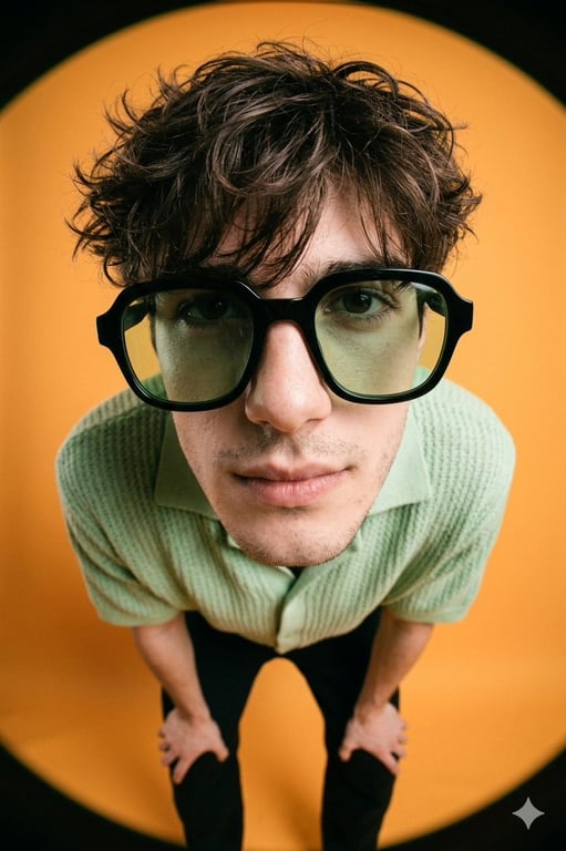 A prompt for generating a high-fashion editorial image of a young man using an exaggerated fisheye lens close-up. The image features bold composition, a solid orange background, and Gen Z summer fashion, requiring the model to maintain facial features from a reference photo.