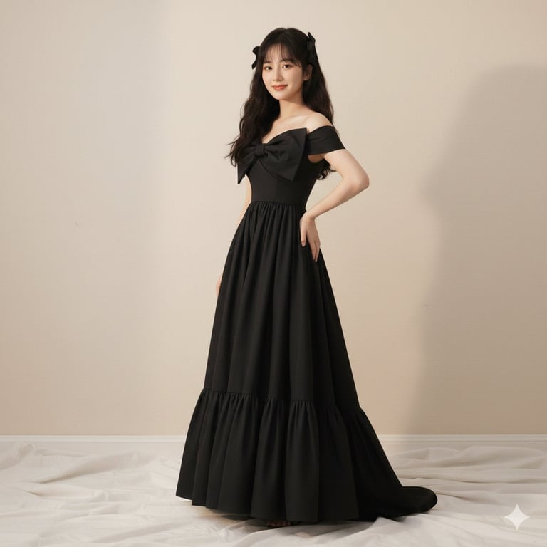 A detailed JSON prompt for generating a high-fashion editorial portrait of Chinese actress Zhao Lusi, seated in a black off-the-shoulder gown with a large structural bow, emphasizing a dewy 'glass-skin' finish, soft lighting, and a dark romance aesthetic.