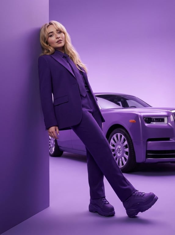 A detailed structured prompt for Nano Banana Pro to generate a high-fashion editorial portrait of a young woman, strictly preserving the identity from a reference image, using a monochrome purple luxury aesthetic, low-angle full-body framing, and soft, dreamy studio lighting.