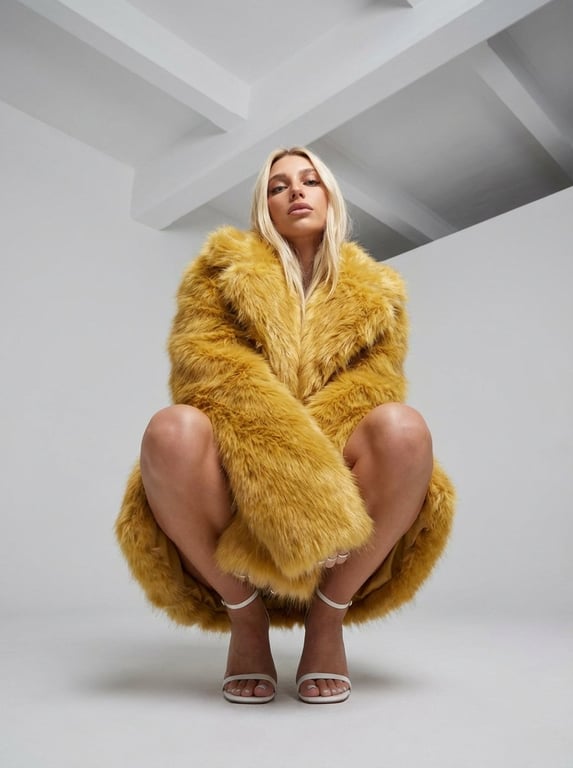 A detailed JSON prompt for generating a high-fashion editorial portrait of a young woman with platinum blonde hair, sitting in a crouched squat pose while draped in an oversized golden yellow shaggy faux fur coat, shot from a dramatic low angle in a minimalist white studio.