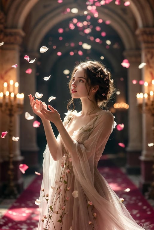 A structured prompt for generating a high-fashion fantasy editorial image. The scene features a female subject gracefully reaching toward floating rose petals in a grand, candlelit hall with dark, romantic tones. The subject wears a translucent silk gown with petals growing on it, aiming for an ultra-realistic, ethereal, and high-contrast look.