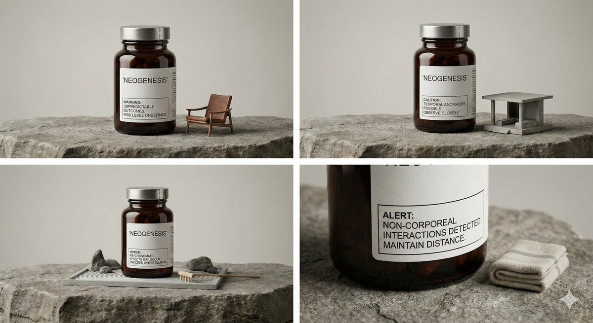 A prompt for generating a high-quality, calm product photograph of a premium nutritional supplement bottle. The composition emphasizes industrial precision contrasted with rough stone texture, and includes a surreal detail: a disproportionately small, unusable miniature lounge chair, symbolizing 'functional displacement.'