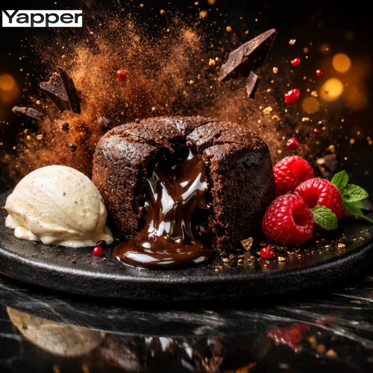 A detailed JSON prompt for generating an ultra-photorealistic, high-speed cinematic photograph of a luxury molten chocolate lava cake, focusing on dynamic action like the chocolate flow and suspended elements, using Nano Banana Pro.