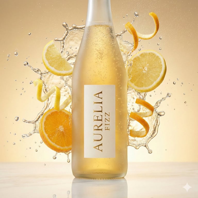 A highly structured JSON prompt for Google Nano Banana Pro and GPT Image 1.5, detailing a high-speed commercial photograph of a frosted glass bottle of 'AURELIA FIZZ' with a dynamic liquid splash explosion, emphasizing luxury studio lighting and 8K photorealism.