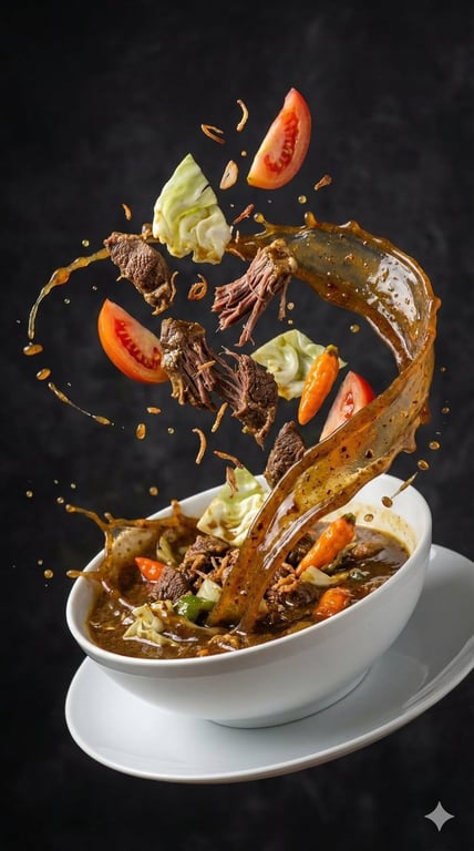 A prompt for generating an ultra-realistic, high-speed photograph of Asian soup ingredients exploding upward in mid-air, focusing on frozen motion, liquid splash crowns, strong rim lighting, and cinematic contrast against a dark background.