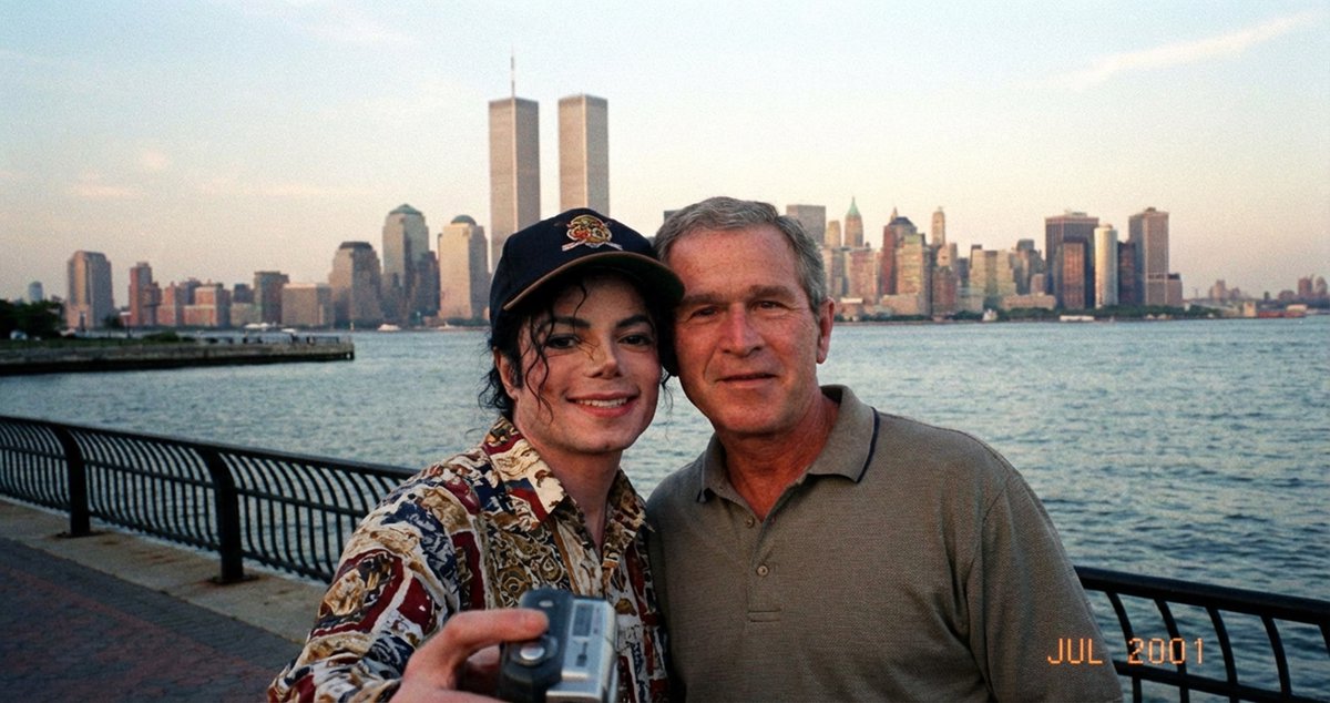 A concise scene prompt for generating a casual selfie of Michael Jackson with George W. Bush in 2001, with the New York skyline and Twin Towers in the background.