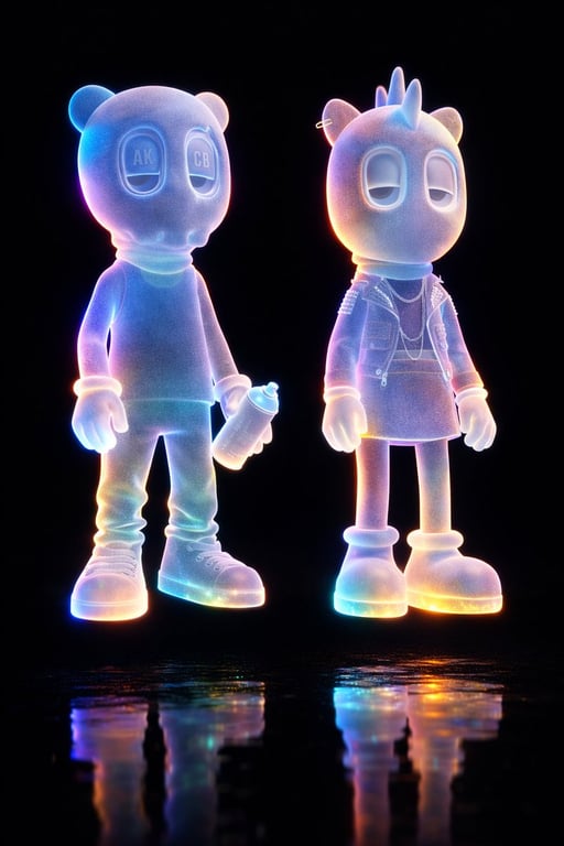 A basic Nano Banana Pro prompt to generate a holographic character made of transparent frosted material, levitating on a glossy black background, with specific camera angle and aspect ratio.