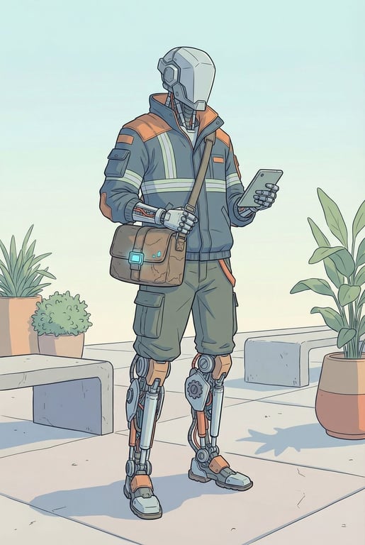 A prompt for generating a full-body humanoid mech adapted for everyday urban life. It specifies a mechanical head with an abstract silhouette (no human features), futuristic wear, exposed mechanical limbs, and a style of sci-fi illustration with clean linework, flat color fields, and a mood of calm, near-future realism.