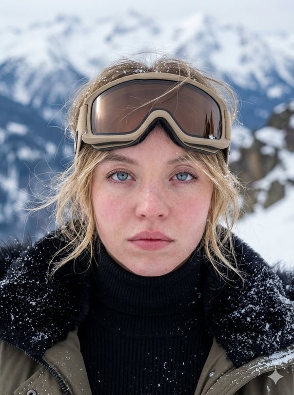 A highly technical, structured prompt for generating an extreme close-up cinematic portrait in an arctic environment. It focuses heavily on hyper-realistic skin texture (freckles, cold flushing), detailed clothing layers (knit turtleneck, fur-collared parka), and specific optical parameters (85mm lens, f/1.8, focus on iris) to achieve a high-fidelity, serene, and cold mood.