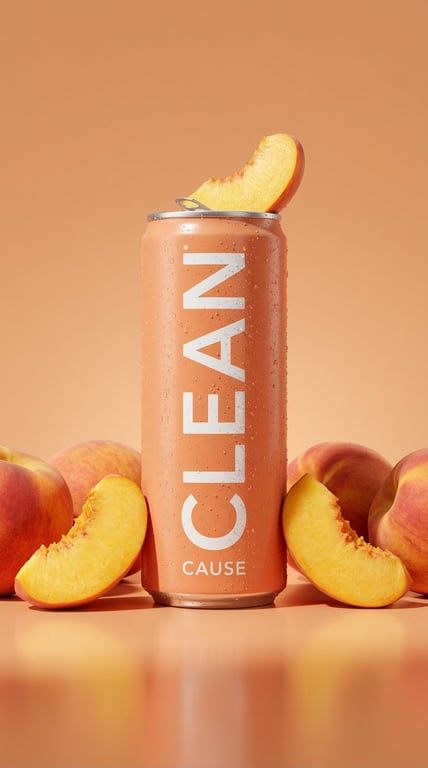 A structured prompt for generating an 8K hyper-photorealistic commercial advertisement for a beverage can. It details a chilled, matte peach-orange aluminum can with condensation, surrounded by ripe peaches and wedges, emphasizing high-end studio lighting, monochromatic warm palette, and sharp focus for a modern, health-forward aesthetic.