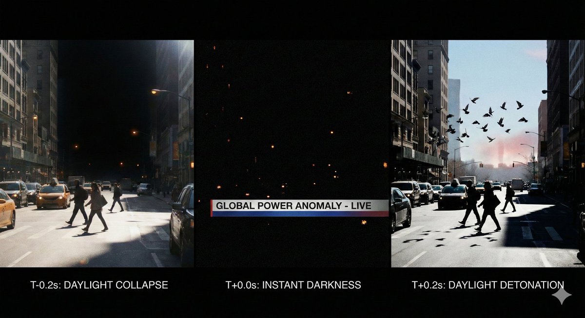 A highly conceptual and technical prompt requesting a hyper-realistic, 16K documentary-style shot capturing the impossible moment the sun briefly turns off. The prompt demands scientific accuracy in lighting physics, atmospheric scattering, and documentary realism (handheld camera, micro-grain), focusing on the terrifying, instantaneous collapse and violent return of daylight and shadows.
