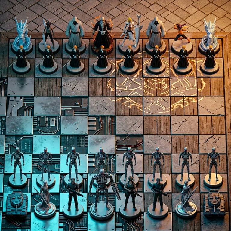 A highly structured Nano Banana 2 prompt template for generating a hyper-realistic, isometric 3D render of a chess set based on a rivalry theme, such as Terminator vs. Bleach. It defines strict rules for board geometry, material morphing, army placement (Foreground vs. Background), piece hierarchy, and specific lighting/color contrast for each faction.