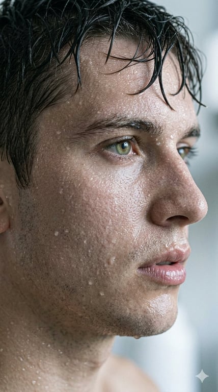 An image generation prompt for nano-banana-pro structured in JSON format, detailing an extreme macro profile of a young man. It specifies hyper-realistic cinematic photography style, focusing on moisture effects (water droplets, sweat), detailed skin texture, specific camera settings (85mm Macro lens, f/1.8), and negative constraints to ensure high quality and realism.