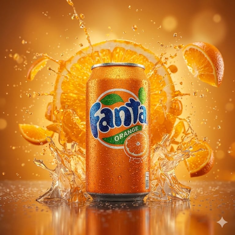 A text prompt for a hyper-realistic cinematic product photograph of a Fanta Orange aluminum can. It specifies the can's ice-cold texture (micro-condensation) and the dynamic scene of fresh orange slices and citrus wedges exploding outward, with juice splashes and translucent pulp fibers frozen mid-air.