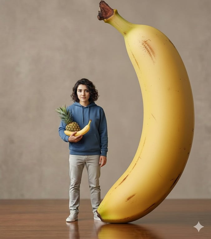 A prompt for generating a hyper-realistic product photography image featuring a giant strawberry on a wooden floor, with a tiny version of an uploaded image standing beside it, holding a small strawberry. The prompt emphasizes cinematic lighting and ultra-detailed textures.