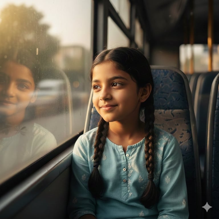 A structured prompt for Gemini Nano Banana Pro to generate a hyper-realistic, candid shot of a young Indian girl sitting by a bus window. It specifies cinematic lighting, bokeh effect, motion blur outside the window, and technical camera details (50mm lens, f/1.8) for an 8K resolution, raw photo style.
